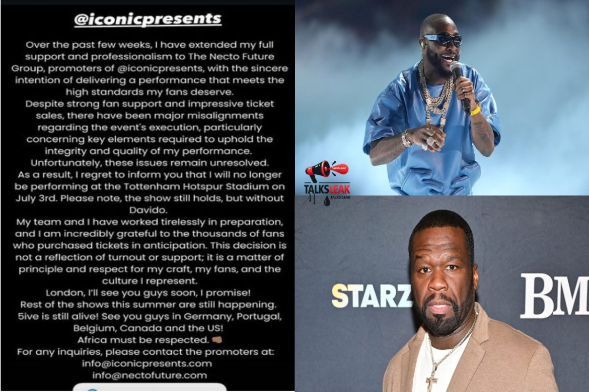 Nigerian music superstar Davido has officially withdrawn from a highly anticipated performance at Tottenham Hotspur Stadium in London, where he was scheduled to appear alongside 50 Cent and Mary J. Blige on July 3, 2025.