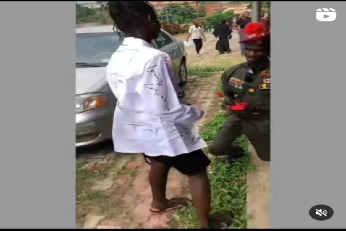 The incident, captured on video and now circulating widely on social media platforms, occurred outside the gates of an unnamed Nigerian tertiary institution during a typical sign-out festivity. Dressed in white T-shirt and jeans marked with signatures and goodwill messages as is tradition the lady was suddenly approached by a man in full uniform.
